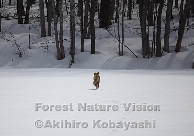 雪に覆われた雪原。平に見えるが落とし穴が隠れているので危険だ。ましてや森の中は一番危ない。野生の生き物達は危ない所は通らないと信じて、キタキツネの足跡を辿って森に入る。