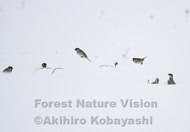 ダム湖へ向かう途中、雪で覆われた田んぼでスズメが騒いでいる。様子を見ていると、イネ科の植物と思われる枯れ草がわずかに雪から出ていた。この時期にはご馳走だ。あと10cmも積もればこの場所も雪の下へ消えてしまう。長い冬は始まったばかりだ。