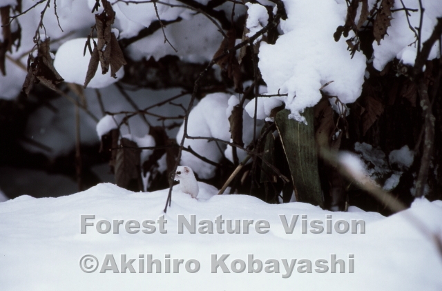 小さな足跡のすぐ側で、笹の間からこぼれて来た雪玉が横に動きながら隙間に吸い込まれて消えて行った。イイズナのようだ。一瞬の出来事。