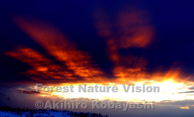 このところ続いた寒波と嵐がやんだ。冬将軍も疲れて一休みか、今日は雪がちらつく程度の静かな天気だ。 生き物達の足跡がはっきりと残っている。 エゾクロテンの足跡をたどり、行動範囲を調べて歩き回る。夕方になったので、稜線に出て下山していると、鉛色の西の空に大きな口が開き、黄金色の放射光が扇を左右に振るように差し込んできた。 「あしたはふぶきだ~ワッハハハ」と、聞こえたように思えた。