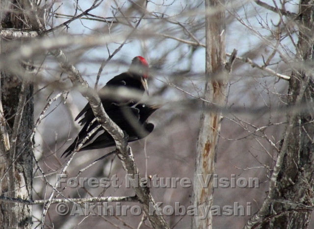 メスのクマゲラが枝に止まりニャーニヤーと鳴き始めた。近くにいたオスがメスの所へやって来た。そして馬乗りになり、怪我をさせないように爪を立てず、羽でバランスを取りながら求愛する。