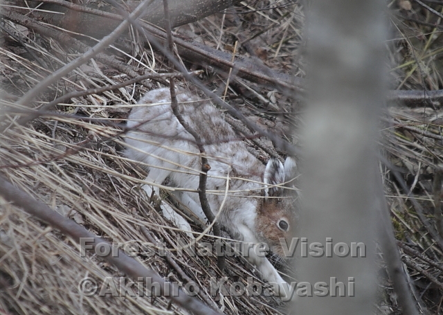 ダム湖畔から雪が解けて歩きやすくなった林道に入る。沢を流れる水の音が心地よい。繁殖の準備に忙しい小鳥たちの様子を見ていると、沢に転がるように降ていく生き物がいる。夏毛に変わりだしたエゾユキウサギだ。立ち並ぶ幼木の間をまるでアルペンスキーの回転競技の様に、右に左へとかわして行く。