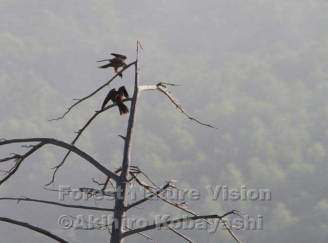 霧が晴れ視界が良くなり時折太陽が顔出す。2羽の先頭のチゴハヤブサが枯れた木に止まった。足にはムクドリと思われる小鳥が見える。寄り添って飛んで来たもう1羽のハヤブサに渡そうとしている。