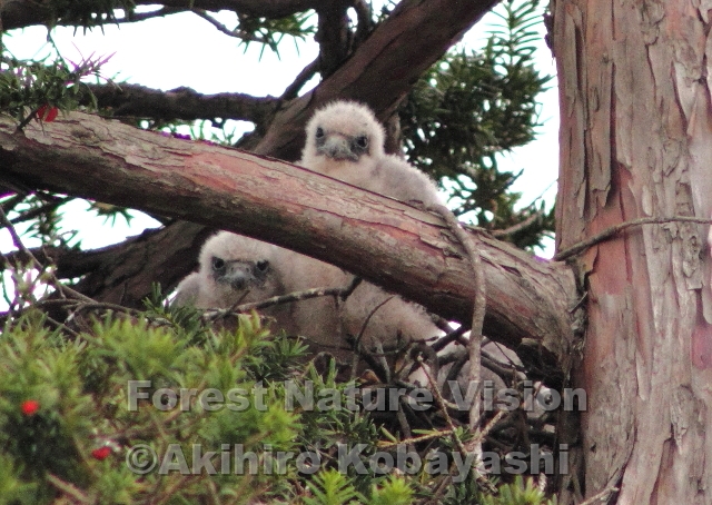 外の様子が気になったのか、巣から顔を出した2羽の雛。巣の中にもう1羽見えるので全部で3羽だ。白い産毛に包まれて暖かそうだ。親が鳴くと鳴き返して巣の中へ戻って行った。