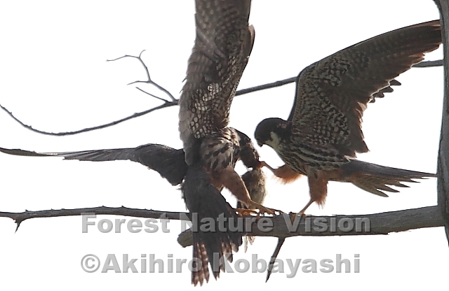 オスが枝に止まりクピクピと優しく鳴くと、巣の近くに止まっていたメスがやって来た。捕らえた獲物をメスに足で差し出すとキーキーキーと嬉しそうに受け取るメス。再びオスは雛の食べ物を捕りに出かけて行く。