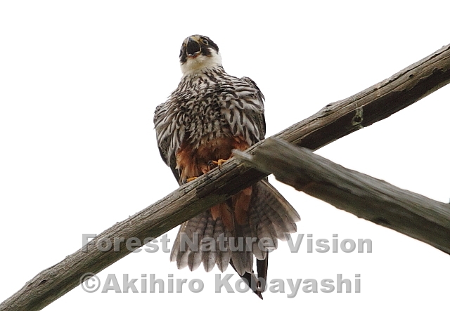 霧でよく見えないのでメスの止まっている木へ近づいてみた。メスが霧の奥を見ながら警戒の鳴声を出した。回りを見ても濃い霧で何も見えないが、確かに何かがいるようだ。