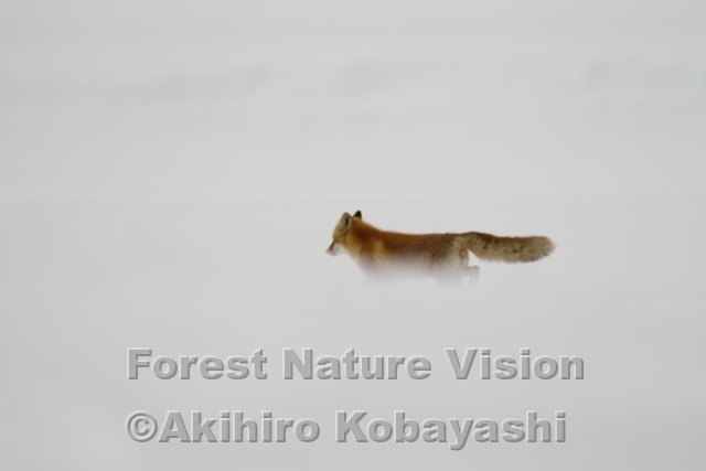 明け方、吹雪いて視界が悪い。ホワイトアウトの中は足を見ながら歩くと酔わない。地吹雪の途切れたので回りの様子を見ると、キタキツネが急ぎ足で通りすぎる。いつもなら立ち止まりこっちを見て行くのだが。何か急ぎの用事があるようだ。再び吹雪いてキツネの姿をかくしてしまった。