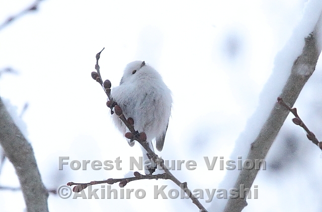 明るくなりだした森の中。降り続いていた雪が止むと、20羽ほどの小鳥の群れが餌を探しながら近づいて来た。群れはコガラかハシブトガラとシマエナガが一緒に行動している。頭の上に雪が音を立てながら転がり落ちて来た。見上げるとエナガが小枝に止まって、そ知らぬ顔で見上げていた。