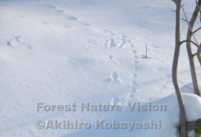 小さな足跡を見つけた。左がイイズナ右がネズミだ。足跡が交わり争った跡が残っている。捕らえたネズミを上の方へと運んで行く様子が分かる。