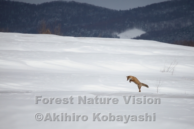 ガサゴソと雪を掘っているうちにネズミが逃げてしまったようだ。場所を変えて再びジャンプ。硬く締まる雪に手こずっている。