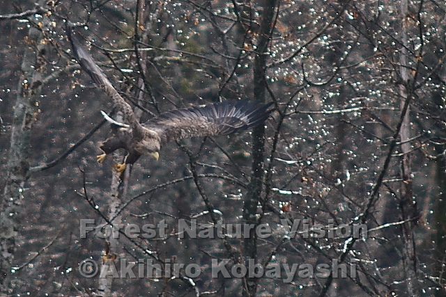 昨日まで二桁の最低気温が、一気にプラスになった。湿った綿雪が雨に変わる。枝についていた雪が、見る間に崩れ落ちてきた。夕方には急に気温が下がり、木々の雫が凍り始めた。木から突然飛びガス大きな鳥。尾が白く見えるのでオジロワシだ。本来、海岸や湖などで見かけるオジロワシ。内陸までやって来るのは、駆除され捨てられたエゾシカの死骸が目当てだ。雪が解けて出て来たのを見つけたようだ。