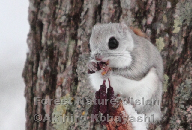 明け方の気温は−6℃と久しぶりに良く温かい。まだ暗い森の中。モモンガがたちが食事の真っ最中だ。ハンノキの6房の花穂を15分程かけて食べる。これを4〜5回繰り返すと森の中は明るくなって、モモンガたちは次々に巣に帰って行く。