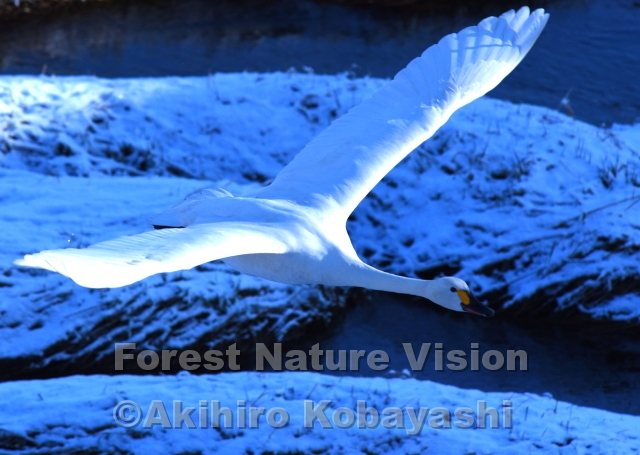 辺り一面雪化粧した河畔。日が上がり騒がしくなるハクチョウたち。次々と水面を蹴って飛んでいく。