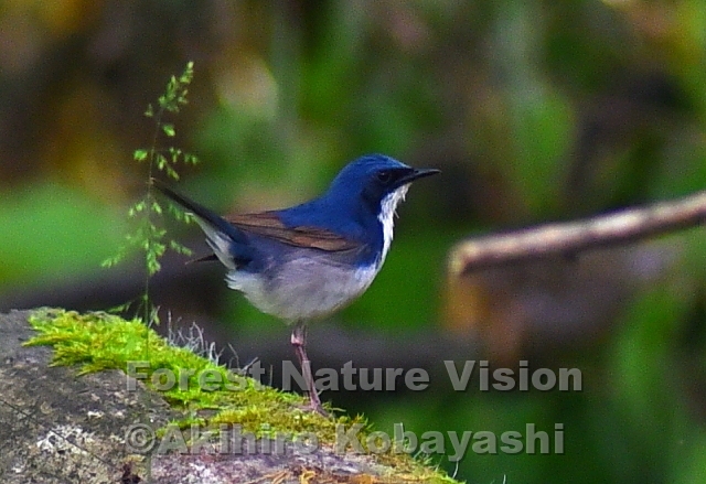 小雨が降る中、森の中に入ると早速薮蚊が歓迎してくれる。突然青い鳥が現れ、倒木の上に止まった。コルリだ。いつもは藪の中で鳴き声は聞くが、姿はなかなか見られない。近くに巣立ったヒナがいる時には、親が捨て身で現れ気を引き、相手をその場から遠ざける行動をとる。天敵の多い野鳥などに見られる行動だ。