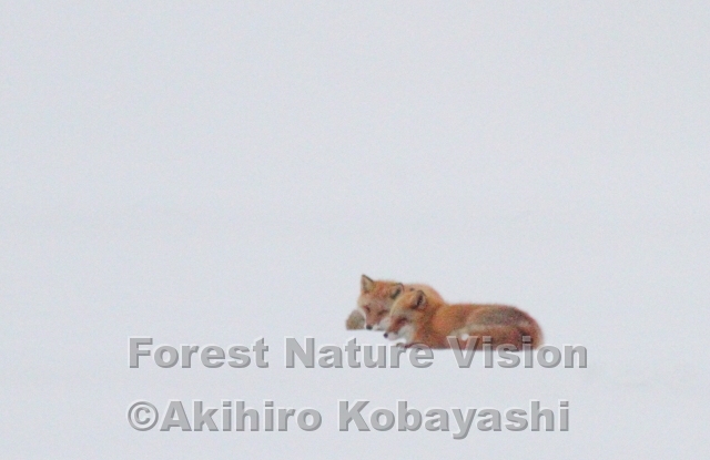 久しぶりに暖かくなった朝。森に向かう途中、いつも出会うキツネの横にもう1頭寝ている。繁殖相手が一緒。今日は暦の上で立春。