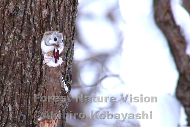 風もなく穏やかな朝。薄暮の中森に入る。小鳥の鳴き声が聞こえ始めた。木の折れた枝でハンノキの穂を持ちながら固まっているモモンガを見つけた。警戒してぴくりともしない。こちらも固まり静かにしていると、ゼンマイ仕掛けのおもちゃの様に動き出し食べ始めた。