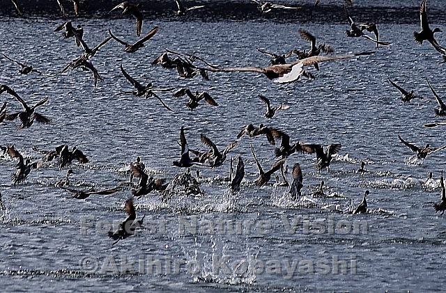 逃遅れたカモの群れに、大きな鳥が白い尾を開き左右に軌道修正しながら迫って行くと、気がついたカモが急いで逃げる。