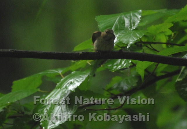 森の中に入ると、雷の音が聞こえて来た。風を伴い激しく降る雨。雨宿りに木の幹にへばりつく。そこへウグイスの子供がやって来た。雨宿りしながら羽を震わせ、濡れた羽の水切りを始めた。