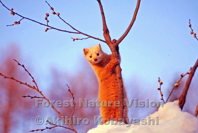 朝、路面はビッカビカのツルッツルだ。天気のよい朝は放射冷却で、やはり冷えこむ。日の出前のパープルシャドウの薄氷をガリバリと割りながら沢沿いに歩く。陽が射すと、森の中はペンキで塗られたように紅色に塗りつぶされて行く。 突然、山姥が刃物を研ぐような音が聞こえた。沢が落ち込む辺りから音が聞こえるが、のぞいても見えない急斜面。ゾリッゾリッという音が近づいてきた。やがて姿を現したのはメスのエゾクロテンだ。アイスクライミングも平気の平左。ネコヤナギにつかまって得意げにポーズをとるお腹が膨らんでいるなー