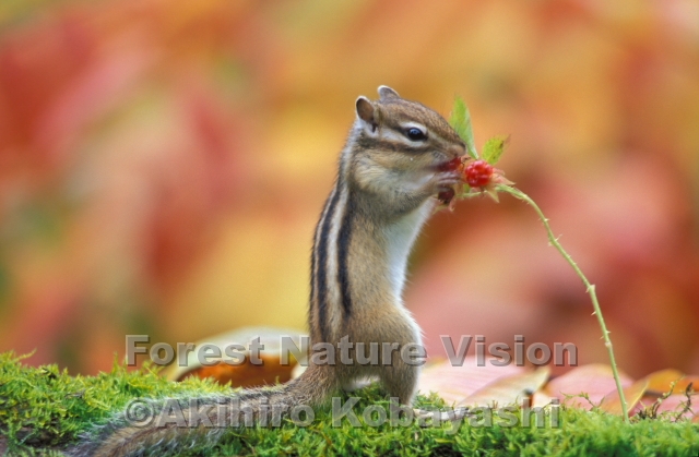 早朝、湖畔林の道を歩いているとコオロギやキリギリスの鳴き声が聞こえる季節になった。雨の降りそうな雲の隙間から朝日が差し込み森を薄紅色に染める。そんな中シマリスに出会う。後ろ向きで何やら食べている。よく見えないので近づくと振り向いたリスの口には赤い実が茎には細かい刺のあるキイチゴだ。
