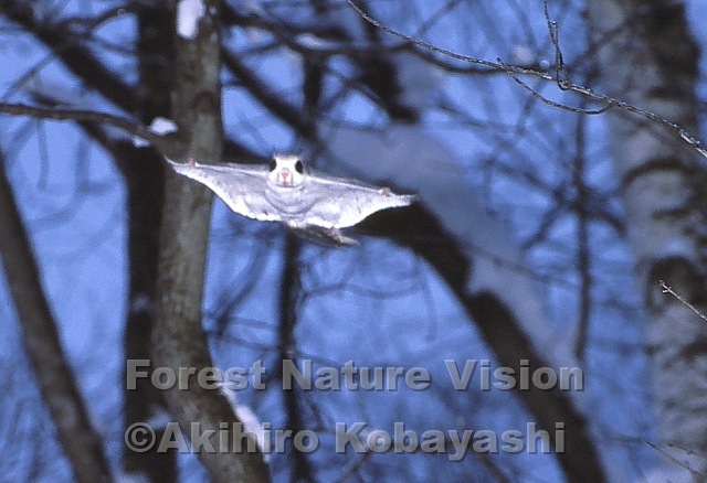 夜明け前の森の中。時間通りに飛んでくるモモンガたち。暗闇が見える目を持つといわれるが、高速で込み入った枝を交わすのは目視だけでは難しいと思われる。障害物までの距離を計測する何かを持っているのかもしれない。以前ヘッドランプを点してスキーで下る途中、突然現れたミズナラの大きな木に受け止められた事があった。木から警告音が出ていたら交わせたかもしれない。野生の生き物たちは人が考える以上の能力を持っている。