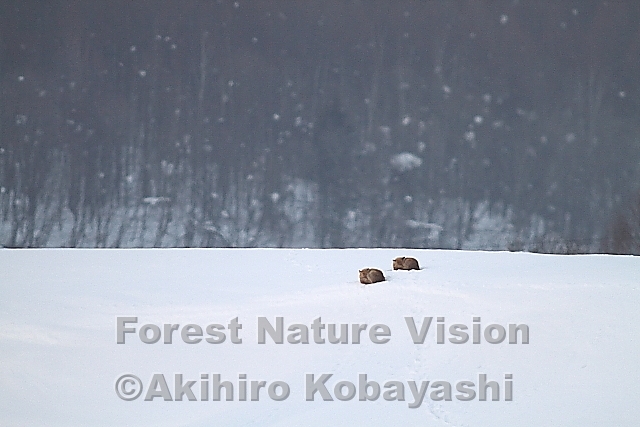 近づいてきたキタキツネ。静かに尾を巻き付けながら数回回って寄り添うように一緒に寝てしまう。互いに争う様子は無いようだ。