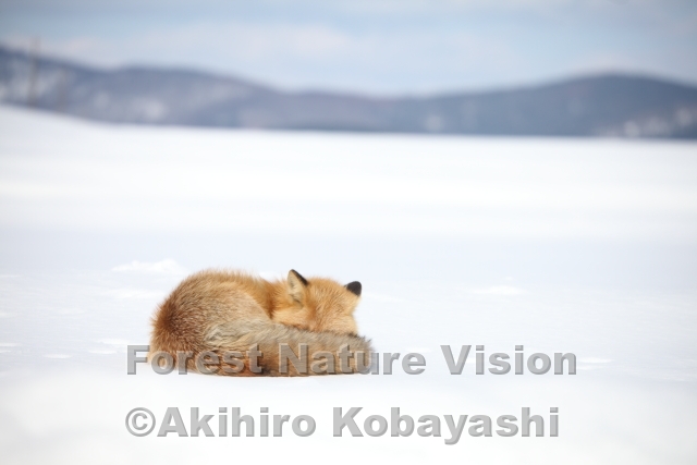 穏やかに晴れた朝。新雪の土手の上で気持ち良さそうに寝ているキタキツネを見つけた。周りを見ても1頭だけだ。メスは出産準備で巣の中に入っているようだ。まだ回りは雪深いが、吹く風は優しくキツネの体をなぜて行く。