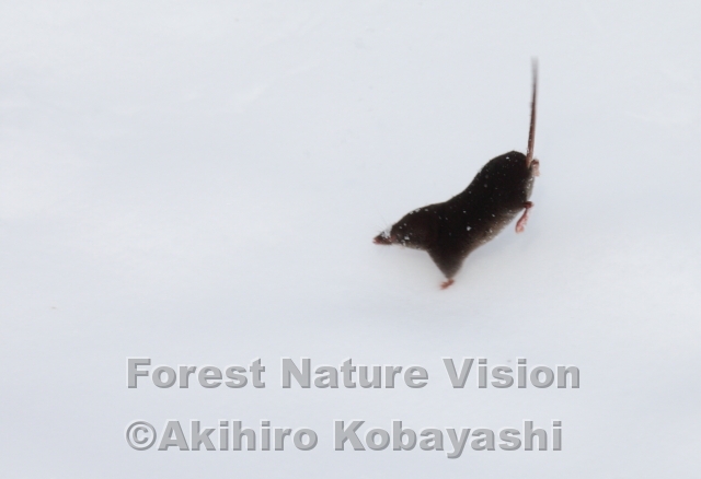 森の中で、すばしこく走り回るエゾトガリネズミを見つけた。時折尾を立てて右に左にと忙しく動き回る。キタキツネがためらいながら見ていた訳はエゾトガリネズミのお腹から出すにおいを嫌がり食べないようだ。