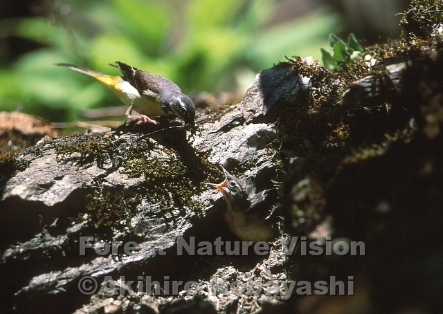 沢沿いの道を歩いていると、キセキレイが大きなトンボをくわえながら、あっちこっちと飛び回る。なかなか食べようとはしない。動かずに様子を見ていると、崖になっている岩の間に飛んでいった。よく見るとそこには大きな口を開けた雛が待っていた。親は雛たちに餌を運ぶのに大忙しだ。